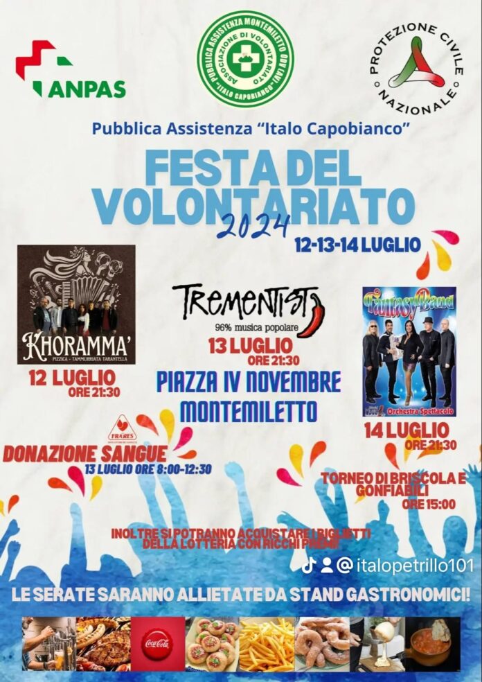 E’ in programma la Festa del Volontariato che si svolgerà nei giorni 12, 13 e 14 luglio in Piazza IV Novembre, a Montemiletto (AV).