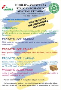 La raccolta partirà domani, sabato 19 marzo, per proseguire fino alla fine del mese. Un secondo step sarà previsto poi ad aprile. Si inizia a raccogliere medicinali, prodotti per l’igiene e generi alimentari.