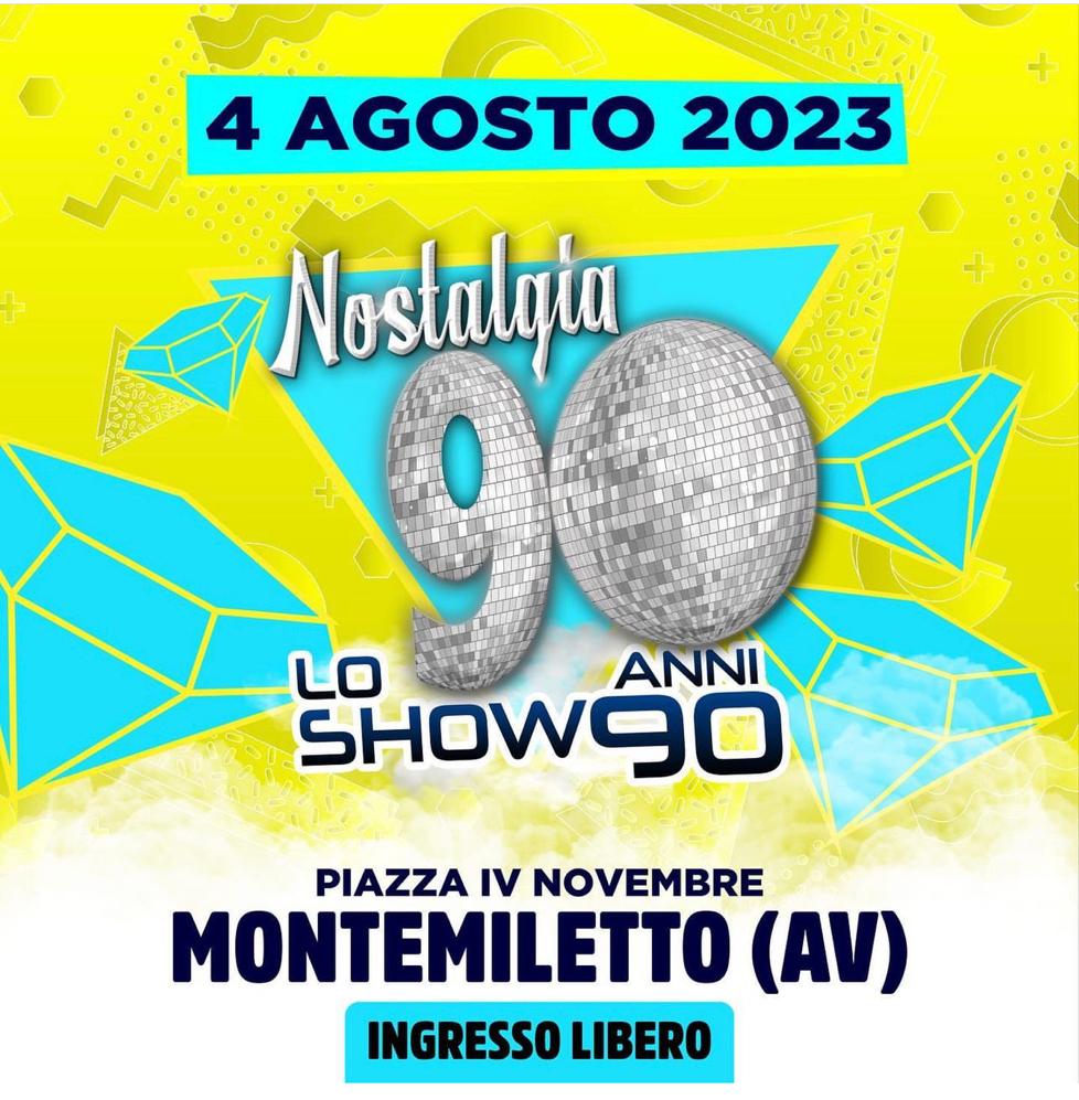 Questa sera, 4 agosto, a Montemiletto, “Nostalgia 90”, quello che si sta rivelando lo show/party più forte d’Italia riempiendo le piazze fino all’inverosimile e coinvolgendo diverse generazioni in uno show con i brani più belli degli anni 90 per ballare e cantare senza sosta. Start alle 21,30, in piazza IV Novembre.