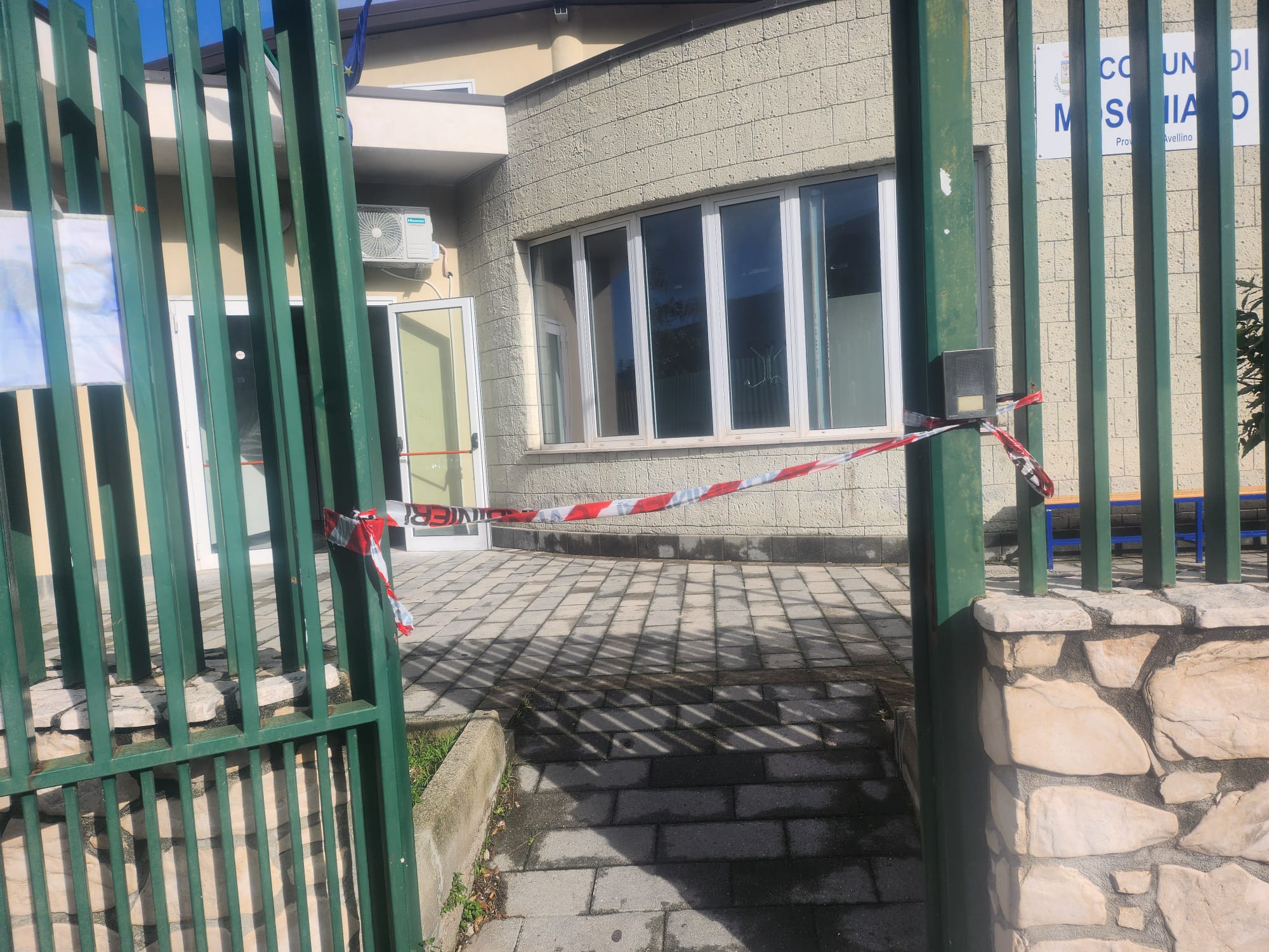 MOSCHIANO- Un nastro per delimitare l’accesso del Comune, chiuso per furto. A distanza di pochi giorni dell’incendio agli uffici comunali, la nuova sede del Municipio di Moschiano torna nel mirino di un raid. Stavolta i malviventi hanno portato via tutti i case dei computer utilizzati dagli uffici comunali. Almeno sette quelli portati via dai malviventi, che hanno fatto accesso agli uffici comunali attraverso la forzatura di un cancello laterale alla sede municipale. Sul raid sono in corso gli accertamenti da parte dei Carabinieri della Compagnia di Baiano. Sono in corso i rilievi da parte dei militari della Stazione di Quindici, agli ordini del luogotenente Giovanni De Cicco e del Nucleo Radiomobile della Compagnia di Baiano. Sul posto anche gli amministratori locali e le persone che stamattina hanno trovato gli uffici comunali chiusi a causa del furto. Almeno dalle prime ipotesi non ci sarebbe nessuna connessione con l’episodio avvenuto qualche giorno fa e scoperto in poche ore da Polizia e Carabinieri.