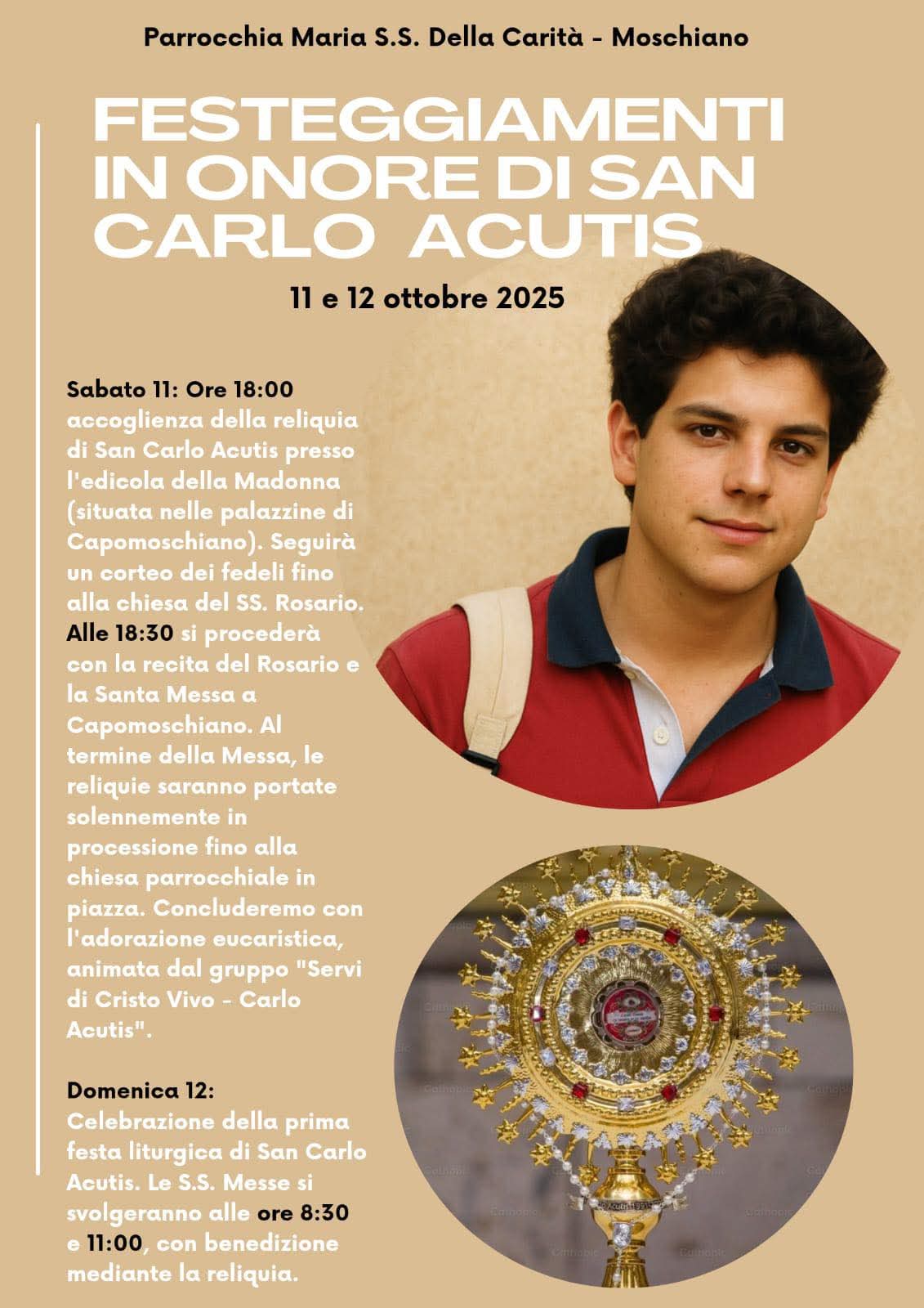 MOSCHIANO- Due giorni di grande fede nel Vallo di Lauro per la prima celebrazione di San Carlo Acutis, dopo la sua canonizzazione avvenuta il 7 settembre scorso. Quelli organizzati dalla Parrocchia di Maria Ss della Carita’ di Moschiano per la sua festa liturgica, che commemora la sua vita e la sua morte, avvenuta all’ età di quindici anni il 12 ottobre del 2006. In questa occasione giungeranno nel comune del Vallo di Lauro le reliquie di San Carlo Acutis. Il programma delle celebrazioni partirà sabato 11 alle ore 18 ci sara’ l’ accoglienza della reliquia di San Carlo Acutis presso l’edicola della Madonna (situata nelle palazzine di Capomoschiano). Seguirà un corteo dei fedeli fino alla chiesa del SS. Rosario. Alle 18:30 si procederà con la recita del Rosario e la Santa Messa Capomoschiano. Al termine della Messa, le reliquie saranno portate solennemente in processione fino alla chiesa parrocchiale in piazza. La serata di celebrazione sarà conclusa con |’adorazione eucaristica, animata dal gruppo “Servi di Cristo Vivo – Carlo Acutis”. Nella mattinata di domenica 12 ci sara’ la Celebrazione della prima festa liturgica di San Carlo Acutis. Le sante messe si svolgeranno alle ore 8:30 e 11:00 con benedizione  della reliquia.