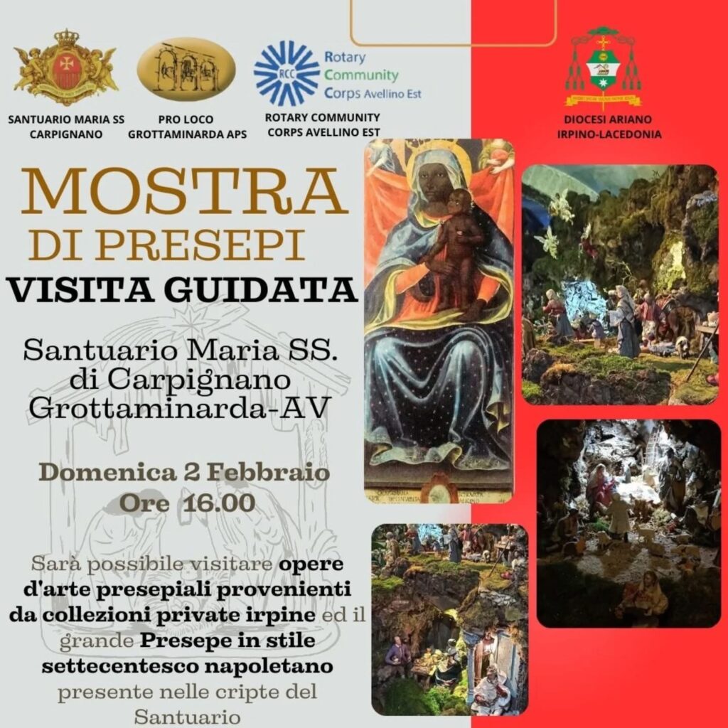 Domenica 2 febbraio 2025, alle ore 16:00, si terrà la giornata conclusiva della Mostra dei Presepi presso il Santuario Maria Santissima di Carpignano, un evento che celebra l’arte tradizionale del presepe in un contesto straordinario. L’iniziativa è organizzata dai Padri Mercedari, dalla Pro Loco Grottaminarda APS e dal Rotary Community Corps Avellino Est, con il patrocinio della Diocesi di Ariano Irpino-Lacedonia.