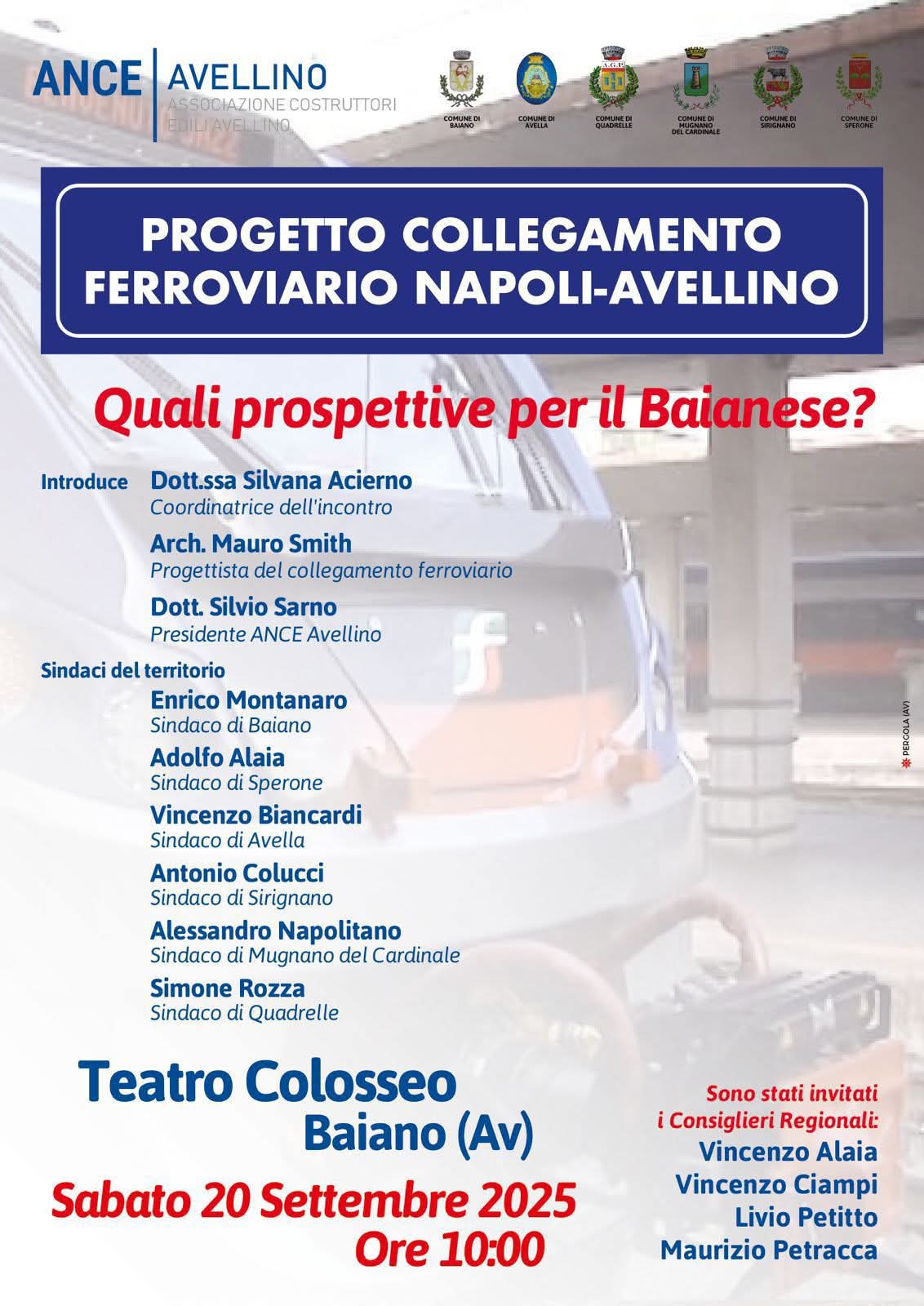 Sabato 20 settembre 2025, alle ore 10:00, il Teatro Colosseo di Baiano ospiterà un incontro pubblico del futuro collegamento ferroviario Napoli-Avellino, con un focus sulle prospettive per il territorio baianese. L’iniziativa è promossa da ANCE Avellino, con il patrocinio dei comuni di Baiano, Avella, Quadrelle, Sirignano, Mugnano del Cardinale, Sperone e Domicella.