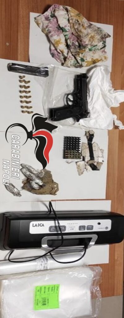 In via Anco Marzio i militari hanno rinvenuto e sequestrato una pistola beretta 98 con matricola abrasa e serbatoio carico di 15 proiettili. Trovati anche altri 18 proiettili e 60 grammi di hashish nascosti in un vaso per i fiori.