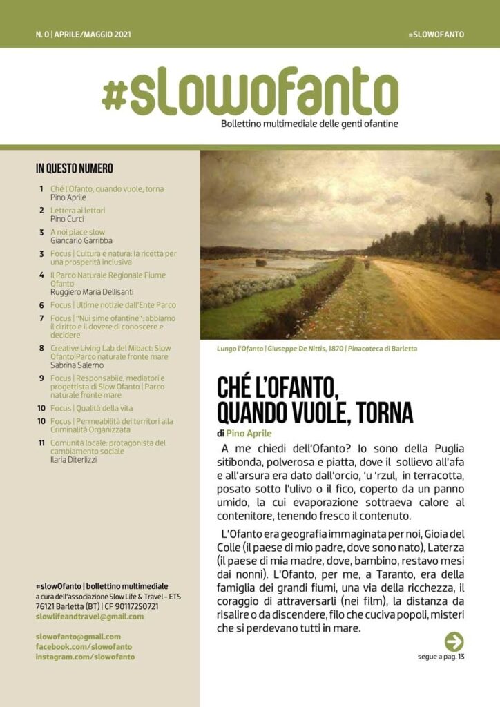 Un anno di pandemia ci consegna un’emergenza diventata cronica che si somma a una crisi già in atto, sociale, economica e ambientale. In una parola: culturale. Gli enormi effetti su ogni aspetto della nostra società e della nostra vita hanno dimostrato ancora una volta il valore dei soggetti che, giorno dopo giorno, praticano la solidarietà, risultando indispensabili nel garantire prima di tutto sicurezza affettiva, nel proteggere le persone che si sentono perse e vuote, le più fragili. È questo il paradigma culturale da diffondere e praticare, al centro vi troviamo persone, ecosistema e relazioni, anziché profitto e individualismo; qualità, autenticità e diversità, anziché quantità, consumo e omologazione. Dinamiche inclusive e in divenire che cercano nei territori e per le comunità le risposte non solo alla disoccupazione e allo spopolamento ma anche alle depressioni, alle ansie e alle paure che disturbano il nostro benessere. Se ci guardiamo attorno non possiamo non renderci conto che il nostro territorio è rappresentato dall’Ofanto, fiume che attende da troppo tempo di tornare al centro della nostra comunità e di farci esclamare nuovamente “nui sime ofantine!”. Slow Ofanto si propone di analizzare i sistemi sociali, culturali, ambientali ed economici, per poi riprogettarli e renderli più forti, sani, inclusivi e sostenibili, forieri di buone pratiche a favore delle generazioni presenti e future, con particolare attenzione al sociale e terzo settore. Progettualità in comune e in divenire, che necessita di alleanze e collaborazioni, di un impegno comune, a più voci e a più a mani. La conoscenza è elemento imprescindibile per supportare responsabilità e impegno. Per questo l’associazione Slow Life & Travel cura e promuove #slowOfanto, un bollettino multimediale finalizzato a diffondere informazioni, storie e protagonisti del territorio ofantino.