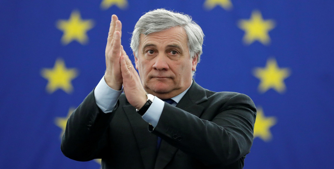 Newly elected European Parliament’s President Antonio Tajani reacts after the announcement of the results of the election at the European Parliament in Strasbourg
