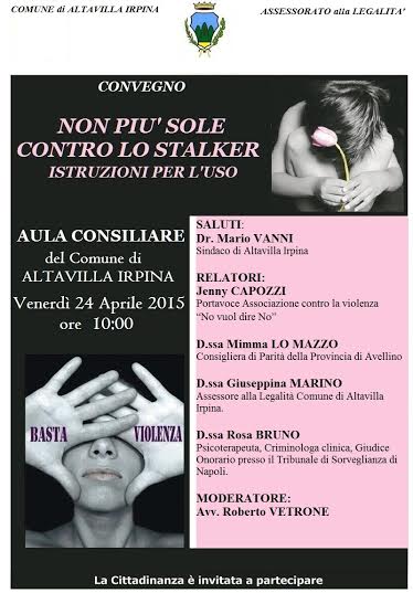Venerdì 24 aprile 2015 alle ore 10,00 presso la sala consiliare del Comune di Altavilla Irpina, organizzato dall’Assessore alla Legalità, si terrà un incontro – dibattito sul tema del contrasto alla violenza di genere dal titolo: “Non più sole contro lo stalker: istruzioni per l’uso”.