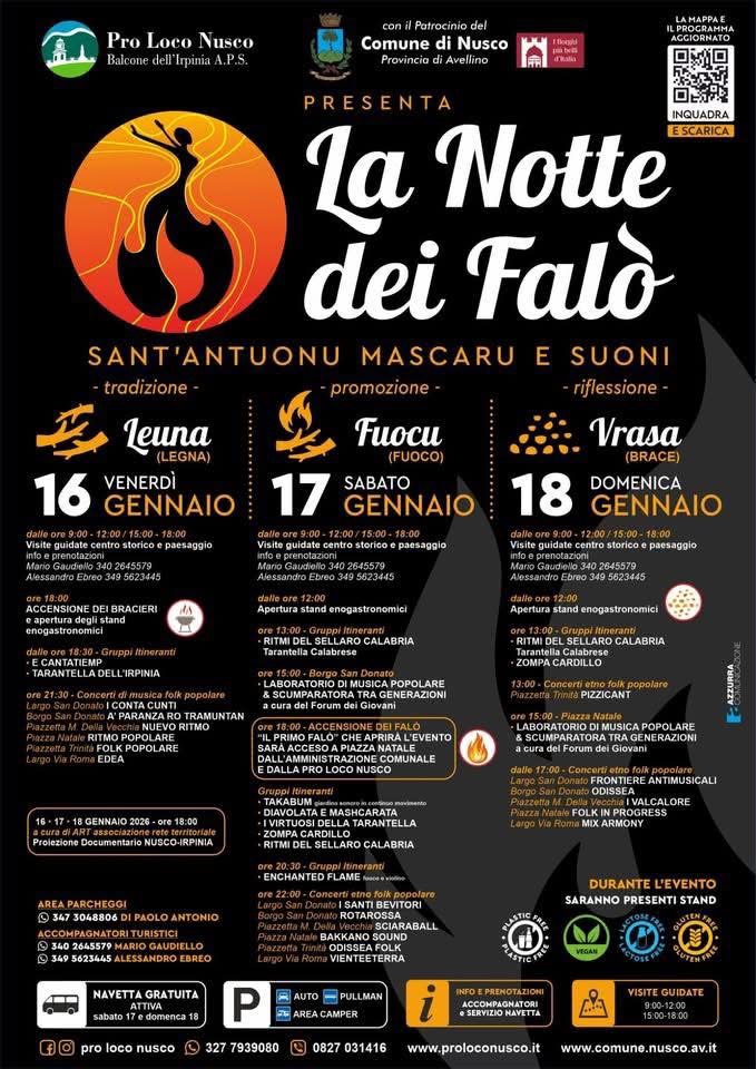 Si accendono oggi i falò e con essi l’anima più autentica di Nusco. La Pro Loco di Nusco annuncia l’inizio della Notte dei Falò 2026, l’evento che dal 16 al 18 gennaio trasforma il borgo antico in un grande spazio di incontro, tradizione e condivisione.