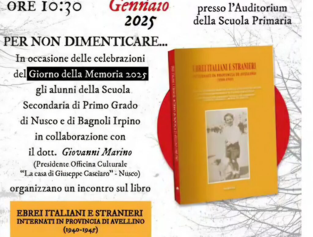 NUSCO- In occasione delle celebrazioni del Giorno della Memoria 2025 gli alunni della Scuola secondaria di Primo Grado di Nusco e di Bagnoli Irpino, in giorno 27 alle ore 10:40 presso l’auditorium della scuola primaria dell’I.C. “J.F. Kennedy” , in collaborazione con il dott. Marino Giovanni (Presidente Officina Culturale “ La casa di Giuseppe Casciaro” -Nusco) hanno organizzato un incontro sul libro “Ebrei italiani o e stranieri internati in provincia di Avellino 1940-1945″ che raccoglie un “ compito di realtà” portato a termine nel 2024 dagli studenti dell’Istituto Comprensivo “ Vittorio Criscuoli “, all’insegna di un impegno costante