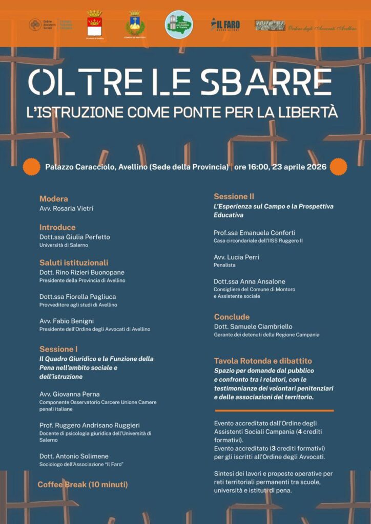 Il 23 aprile 2026, presso Palazzo Caracciolo di Avellino, sede della Provincia, si svolgerà il convegno “Oltre le Sbarre: L’Istruzione come Ponte per la Libertà”, organizzato dalla Dottoressa Giulia Perfetto dell’Università di Salerno. Un importante momento di riflessione e confronto su un tema di grande rilevanza sociale ed educativa, che, in qualità di organizzatrice, ho fortemente voluto sia per il ruolo che rappresento e sia per i valori che caratterizzano i miei studi e le mie ricerche. Ho sempre ritenuto fondamentale promuovere occasioni di dialogo che valorizzino il ruolo dell’istruzione quale strumento di inclusione, di crescita e di reale, concreta possibilità di reinserimento sociale, anche nei contesti penitenziari, quei contesti di cui poco si discute, poco si sa e poco si fa. Pertanto desidero esprimere un sentito e importante ringraziamento a tutti coloro che hanno reso possibile la realizzazione dell’evento: all’Avv. Rosaria Vietri, alla Dott. ssa Anna Ansalone e all’Avv. Lucia Perri per la moderazione e per gli interventi autorevoli e puntuali; al Dott. Rino Rizieri Buonopane, Presidente della Provincia di Avellino, per il sostegno istituzionale e l’accoglienza a Palazzo Caracciolo; all’Avv. Fabio Benigni, Presidente dell’Ordine degli Avvocati di Avellino, per la significativa partecipazione e per aver accettato di promuovere questo convegno anche come momento di formazione per gli iscritti all’Ordine degli Avvocati, dando notevole autorevolezza; un sentito ringraziamento all’Avv. Giovanna Perna per il continuo dialogo e confronto; alla Dott.ssa Fiorella Pagliuca per la costante e sensibile attenzione rivolta al mondo della scuola; al Professore Ruggero Andrisano Ruggieri dell’Università di Salerno e alla stessa università tutta che appoggia sempre le mie iniziative; a tutti i relatori che interverranno nelle due sessioni, per l’elevato contributo scientifico di ogni figura professionale, sociologi, psicologi pedagogisti; ai partecipanti, ai volontari penitenziari e alle associazioni del territorio, per le testimonianze e il proficuo confronto; al Dott. Samuele Cimbriello per le autorevoli conclusioni. L’iniziativa rappresenta un’occasione preziosa per rafforzare il dialogo tra istituzioni, scuola, università e territorio, con l’auspicio di consolidare reti permanenti capaci di promuovere percorsi educativi efficaci anche all’interno degli istituti di pena. Ringrazio tutti per la partecipazione e per il contributo offerto a un dibattito di così alto valore.