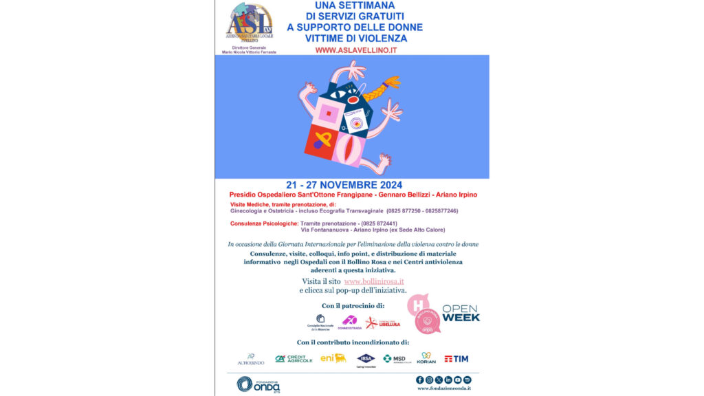 Fondazione Onda ETS e ASL di Avellino, in occasione della Giornata Internazionale per l’eliminazione della violenza contro le donne che si celebra il 25 novembre, lanciano la quarta edizione dell’(H) Open Week che si terrà dal 21 al 27 novembre con l’obiettivo di incoraggiare le donne vittime di violenza a rompere il silenzio e avvicinarle alla rete di servizi antiviolenza. L’Azienda Sanitaria Locale, diretta da Mario Nicola Vittorio Ferrante, in collaborazione con l’Azienda Consortile Ambito A1, ha programmato l’offerta gratuita, previa prenotazione, di consulenze e visite ginecologiche con ecografia transvaginalepresso l’UOC Ginecologia e Ostetricia del P.O. “Frangipane-Bellizzi” di Ariano Irpino e la possibilità di accedere a consulti psicologici presso l’Ambito A1.