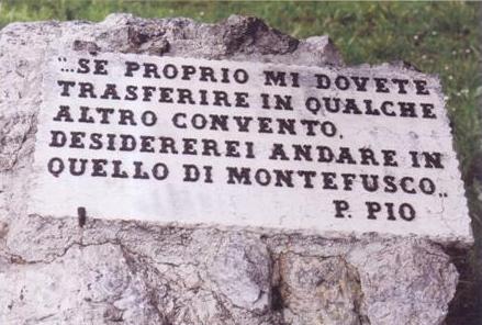 suo soggiorno montefuscano, testimoniato da una lettera scritta nel 1923 a Padre Paolino da Casacalenda nei giorni antecedenti al suo trasferimento definitivo a San Giovanni Rotondo: “Se proprio dovete trasferirmi in un altro convento, desidererei andare in quello di Montefusco”. Tale frase brilla sulla pietra posta accanto al monumento eretto in suo onore nel piazzale del convento del piccolo paese avellinese.