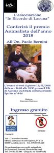 L’ Associazione In Ricordo di Lacuna annuncia che il Premio “Animalista dell’Anno 2018” sarà conferito all’ onorevole Paolo Bernini.