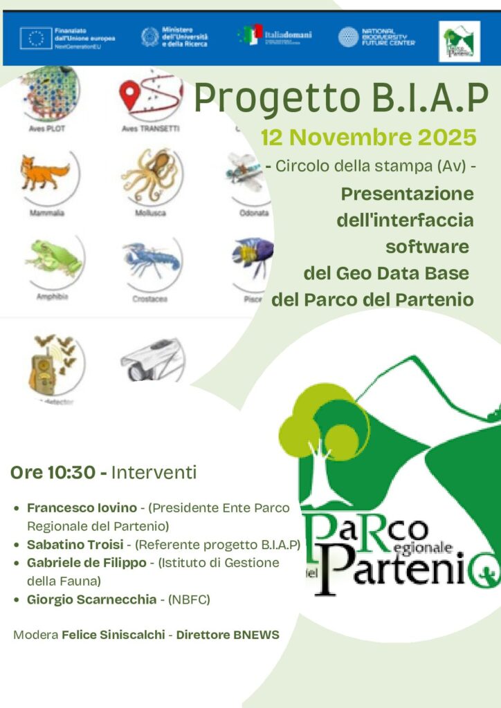 Il Parco Regionale del Partenio presenterà mercoledì 12 novembre 2025, alle ore 10.30, presso il Circolo della Stampa di Avellino, la nuova interfaccia software del Geo Data Base del Parco, sviluppata nell’ambito del progetto “Biodiversità e Impatto Antropico nel Parco del Partenio (B.I.A.P.)”, finanziato dal National Biodiversity Future Center (NBFC).