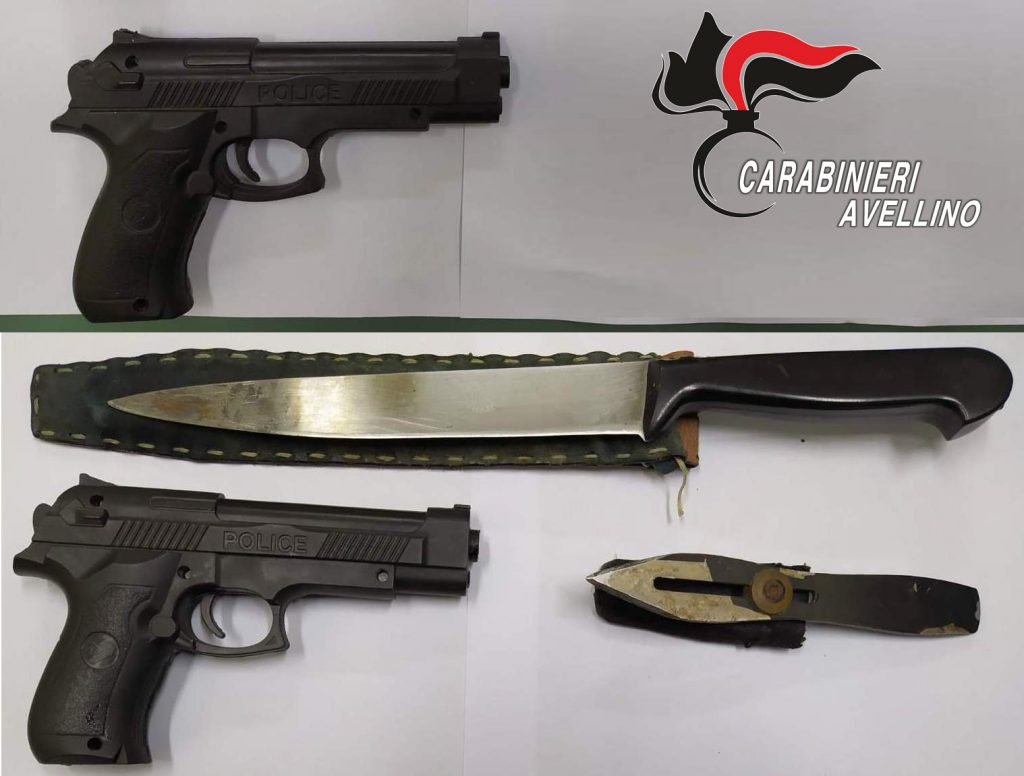 Identificato in un 50enne di Montoro, lo stesso all’esito dell’immediata perquisizione è stato provato in possesso di due pistole di tipo giocattolo (una occultata nella tasca del suo giubbotto e una all’interno di una borsa), entrambe prive di tappo rosso, nonché di un grosso coltello e di un pugnale che portava rispettivamente nei calzini e nella cintura del pantalone.