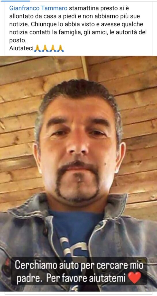 Stamattina presto si è allontanato da casa a piedi e non si hanno più sue notizie. Si tratta di Granfranco Tammaro, di Paternopoli, comunità che sta vivendo ore di grande ansia. Sui social è stata diffusa la foto dell’uomo. Ed è scritto: “Chiunque lo abbia visto e avesse qualche notizia contatti la famiglia, gli amici, le autorità del posto”. In molti si stanno attivando per le sue ricerche