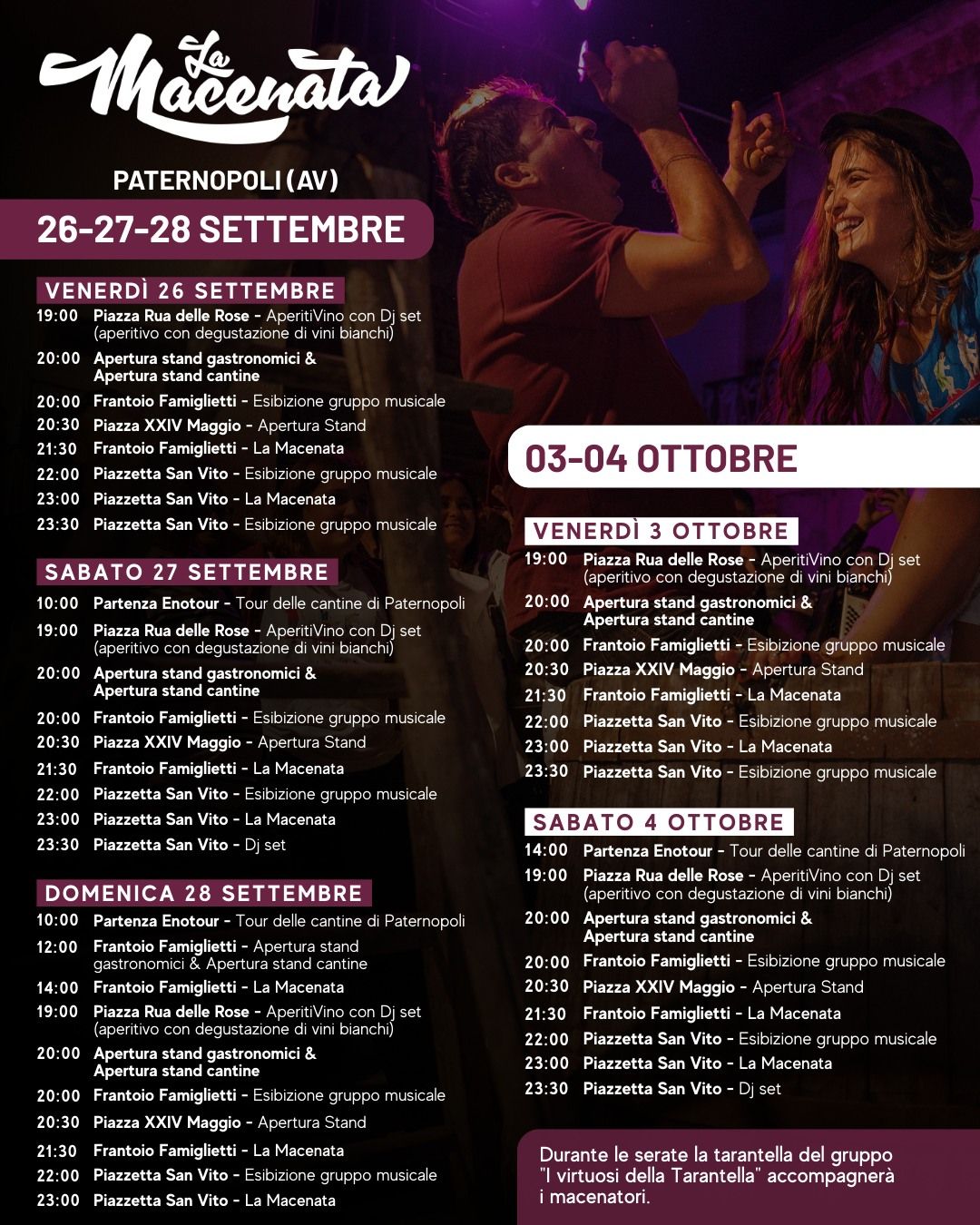 Oltre alla tradizionale pigiatura, il pubblico potrà partecipare a degustazioni di vini locali, visite alle cantine, stand gastronomici e concerti nelle piazze del paese, accompagnati dall’energia dei migliori gruppi musicali e DJ set.