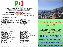 E’ tutto pronto per il convegno pubblico promosso dal circolo PD “Martin Luther King” di Paternopoli sul tema: “Il buon governo degli enti locali in una regione Campania moderna e rinnovata” con il sindaco di Salerno, Vincenzo De Luca. L’appuntamento è per venerdì 13 marzo nella sala ottagonale del centro Cepas di Paternopoli alle ore 17.00. Parteciperanno: Franco Vittoria (coordinatore provinciale del PD di Avellino), Michele Figliuolo (Coordinatore provinciale del PD di Salerno), Pino Galasso (sindaco di Avellino), Rodolfo Salzarulo (sindaco di Lioni), Giovanni Ianniciello (sindaco di Grottaminarda), Luigi Famiglietti (sindaco di Frigento), Francesco Maselli (Presidente Alto Calore Servizi), Alberta De Simone (ex presidente della Provincia di Avellino), Aniello Chieffo (vice-presidente Comunità Montana Terminio – Cervialto e Sindaco di Bagnoli Irpino), Rosanna Repole (ex presidente del Piano di Zona Sociale “Alta Irpinia”), Emiliana Mannese (responsabile cultura per il PD regionale), Michele Marzullo (amministratore comunale di Senerchia), Vincenzo Petruzziello (segretario Cgil), Antonio Festa (segretario Uil), Andrea Losco (europarlamentare Pd), Gerardo Adiglietti (vice segretario Pd), Enzo Venezia (dirigente Pd), Bernardino Tirri (dirigente Pd), Rosetta D’Amelio (dirigente regionale Pd), Lello De Stefano (dirigente Pd), Vanni Chieffo (dirigente Pd), Chiara Maffei (dirigente Pd), Peppino Di Iorio (dirigente Pd), Antonio Petruzzo (delegato provinciale Pd), Mino Mastromarino (delegato provinciale Pd), Carlo Petruzziello (sindaco di Chiusano), Eugenio Tecce (sindaco di Castelfranci), Giovanni Ferrante (sindaco di Luogosano), Walter Pescatore (sindaco di Castelvetere), Pasquale Iannuzzo (assessore di Fontanarosa), Wanda Grassi (sindaco di Montefalcione), Antonio Giacobbe (sindaco di Flumeri), Nunzia Barile (sindaco di Salza), Giuseppe Sierchio (sindaco di Calabritto), Aldo Laurenzano (sindaco di Atripalda), Gerardo Capozza (sindaco di Morra), Pasquale Ricci (sindaco di S.Martino V.C.), Michelangelo Ciarcia (sindaco di Venticano), Angelantonio Caruso (ex sindaco di Andretta), Gelsonimo Centanni (vice sindaco Calabritto), Michelangelo Cetta (vice sindaco S.Angelo dei L.), Vincenzo Di Marino (vice sindaco di Villamaina), Salvatore Biazzo (assessore di Avellino), Francesco Todisco (consigliere di Avellino), Guido D’Avanzo (capogruppo Pd al Comune di Avellino), Antonio Ninfadoro (capogruppo Pd al Comune di Ariano), Annarita Colantuono (capogruppo Pd al Comune di Paternopoli), Antonio Rauzzino (amministratore comunale di Paternpoli), Mario Cuozzo (amministratore di Calabritto), Salvatore Ruggiero (assessore di Lioni), Toni Ricciardi (consigliere di Castelfranci), Tommaso Cozzolino (assessore di Taurasi), Giuseppe Trunfio (assessore di Villamaina), Paolo Saggese (amministratore di Torella), Franco Chieffo (ex consigliere comunale di Montella), Arcangelo Lodise (amministratore di Torella), Alfonso Giovine (assessore di Calabritto), Raffaele Giusto (vice coordinatore Pd di Paternopoli).
