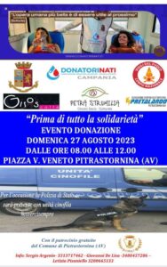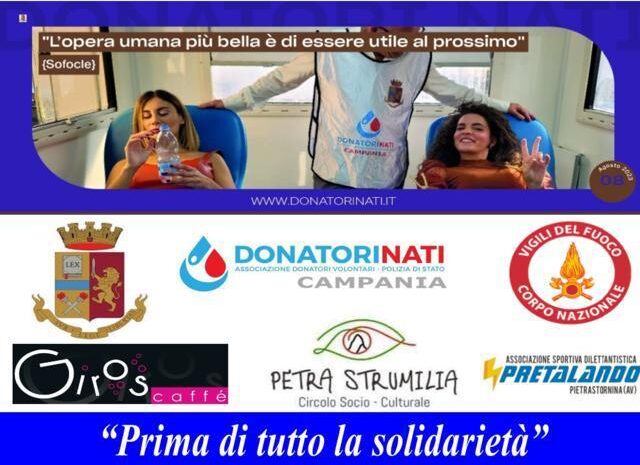 Chi dona il sangue, dona la vita: Tappa a Pietrastornina per DonatoriNati. Una raccolta straordinaria di sangue, organizzata dal Circolo Socio Culturale PetraStrumilia, dall’Associazione Pretalando e DonatoriNati Polizia di Stato e patrocinata dal Comune. Essere tra la gente e per la gente. Polizia di Stato e Vigili del Fuoco con i loro uomini e donne portano avanti, in tutta Italia, un grande obiettivo: diffondere sempre più la cultura della donazione di sangue.