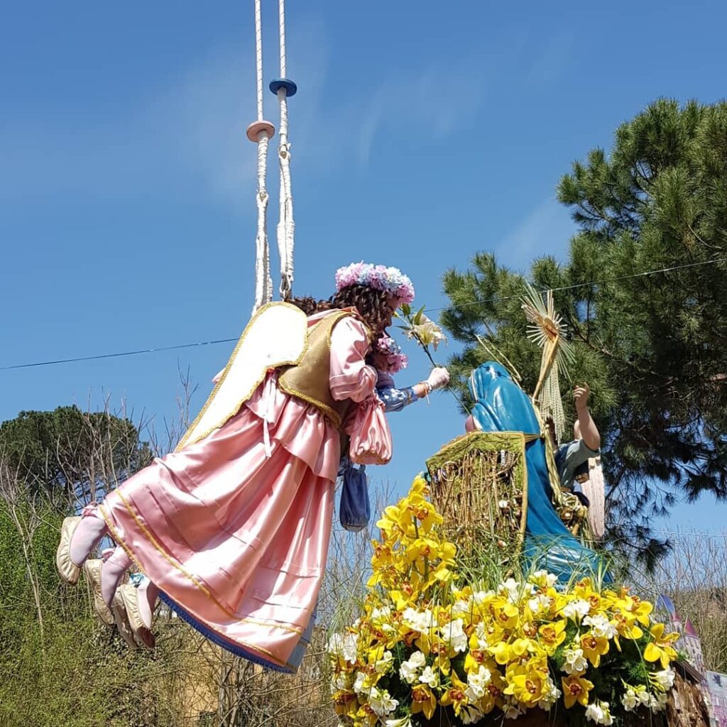 Tra i momenti più attesi, spicca il suggestivo Volo degli Angeli, che si svolgerà sabato sera al termine della Celebrazione Eucaristica e domenica mattina al termine della processione: una tradizione secolare che tocca il cuore di chiunque vi assista. Due bambine, le cosiddette Nunziatine, sospese in aria tramite un cavo d’acciaio, intonano un canto rivolto alla Madonna, nel piazzale dell’Arcibasilica, in un’immagine di struggente bellezza. Un tempo, a ricoprire questo ruolo erano donne provenienti da Napoli, munite di caschi e parrucche. Solo negli anni ’20-’30 del Novecento, grazie alla famiglia Medugno, si iniziò a coinvolgere le bambine del paese, rendendo il rito ancora più autentico e comunitario.
