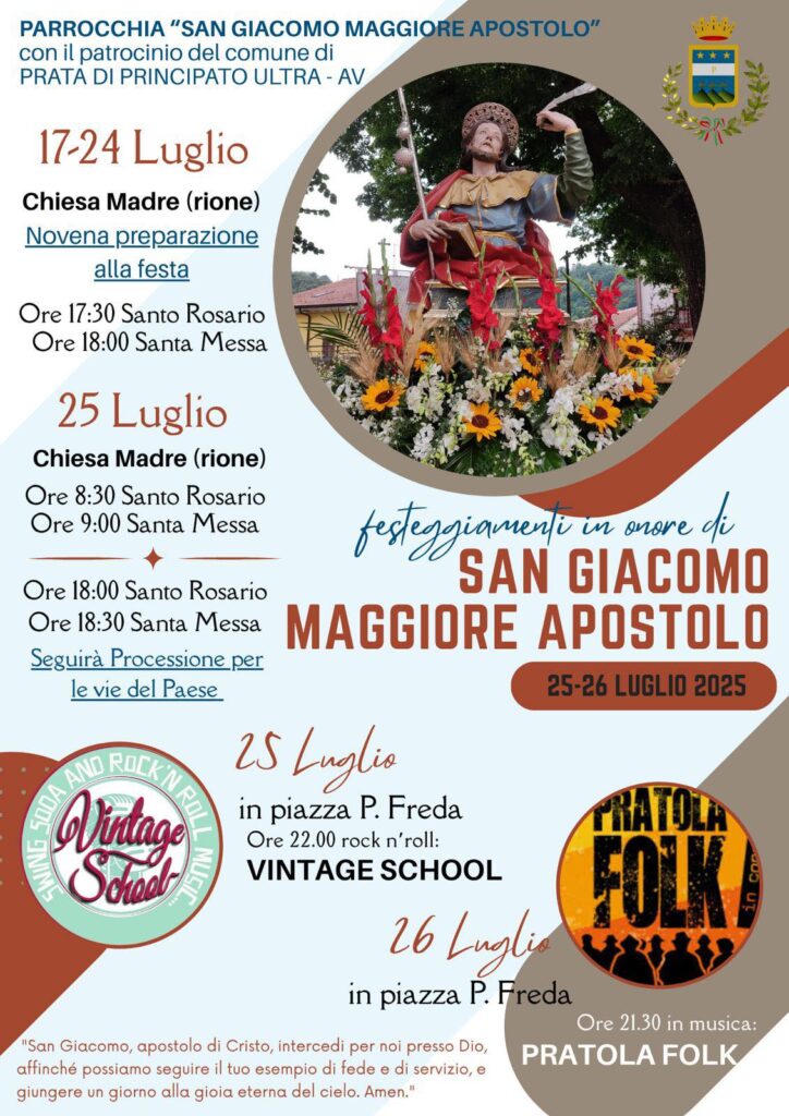 A Prata di Principato Ultra, la Festa di San Giacomo è un rito che si rinnova, un sentimento che si tramanda, un cammino che coinvolge un’intera comunità. Dal 17 al 26 luglio, il paese si prepara a vivere giorni intensi, sospesi tra spiritualità e tradizione popolare, tra silenzio e musica, tra memoria e appartenenza.