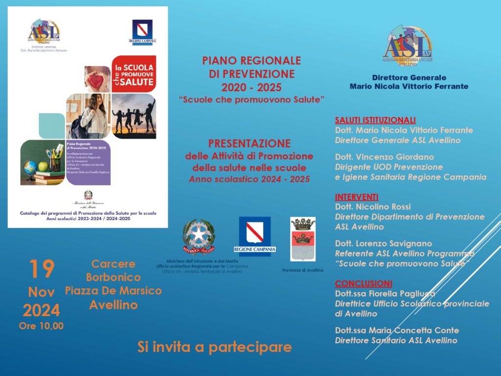 Alla presentazione del programma, dopo i saluti istituzionali del Direttore Generale ASL Avellino, Mario Nicola Vittorio Ferrante; Dirigente UOD Prevenzione e Igiene Sanitaria Regione Campania, Vincenzo Giordano, interverranno: il Direttore Dipartimento di Prevenzione ASL Avellino, Nicolino Rossi; il Referente ASL Avellino Programma “Scuole che promuovono Salute”, Lorenzo Savignano; la Direttrice dell’Ufficio Scolastico provinciale di Avellino, Dott.ssa Fiorella Pagliuca; Direttore Sanitario ASL Avellino, Dott.ssa Maria Concetta Conte.