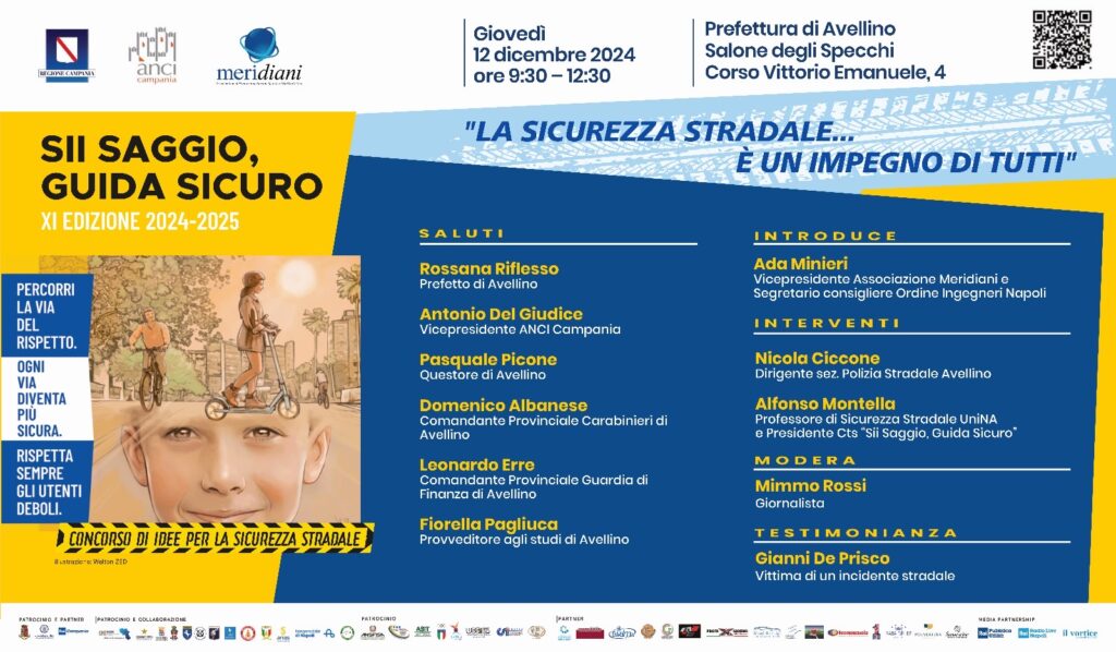 I saluti di Rossana Riflesso, Prefetto di Avellino, Antonio De Giudice, Vicepresidente ANCI Campania, Pasquale Picone, Questore di Avellino, Domenico Albanese, Comandante Provinciale Carabinieri di Avellino, Leonardo Erre, Comandante Provinciale Guardia di Finanza di Avellino e Fiorella Pagliuca, Provveditore agli studi di Avellino precedono gli interventi di Ada Minieri, Vicepresidente dell’Associazione Meridiani e Consigliere segretario dell’Ordine Ingegneri della provincia Napoli , Nicola Ciccone, Dirigente sezione Polizia Stradale Avellino e Alfonso Montella, Professore di Sicurezza Stradale Università di Napoli Federico II e Presidente Cts “Sii Saggio, Guida Sicuro”. Modera l’incontro Mimmo Rossi, giornalista.