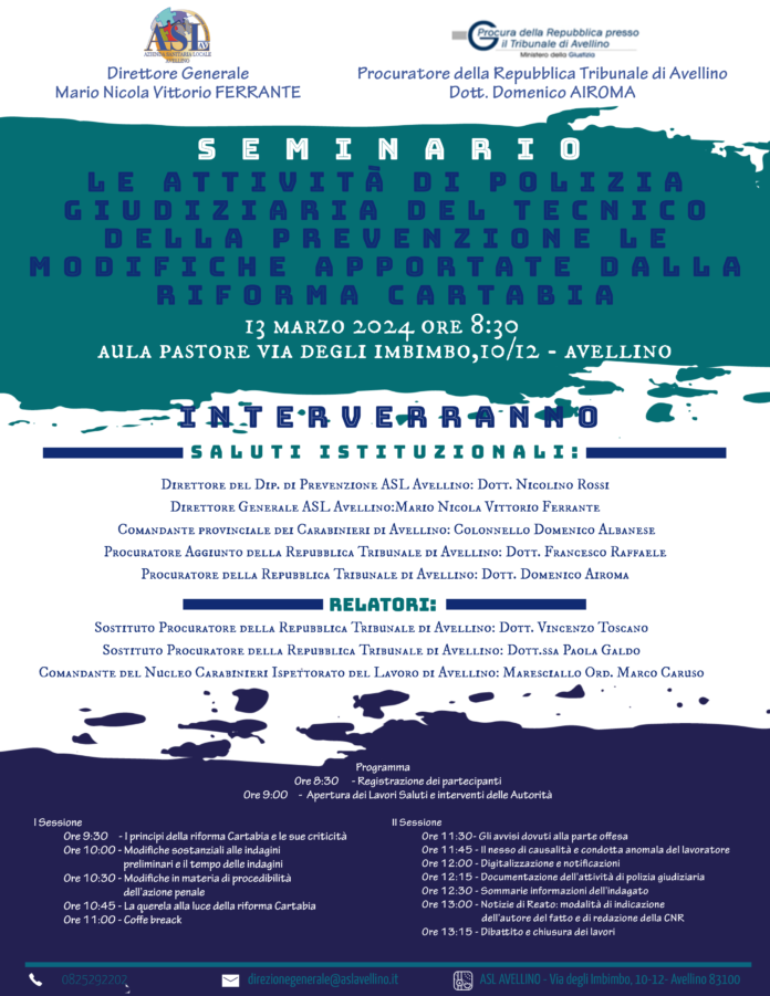 Dopo i saluti del Direttore del Dipartimento di Prevenzione, Dott. Nicolino Rossi, del Direttore Generale ASL Avellino, Dott. Mario Nicola Vittorio Ferrante, del Comandante Provinciale dei Carabinieri, Col. Domenico Albanese, del Procuratore Aggiunto della Repubblica Tribunale di Avellino, Dott. Francesco Raffaele, del Procuratore della Repubblica Tribunale di Avellino, Dott. Domenico Airoma, seguiranno gli interventi del Dott. Vincenzo Toscano, Sostituto Procuratore della Repubblica Tribunale di Avellino, Dott.ssa Paola Galdo, Sostituto Procuratore della Repubblica Tribunale di Avellino, Maresciallo Ord. Marco Caruso, Comandante del Nucleo dei Carabinieri Ispettorato del Lavoro di Avellino.