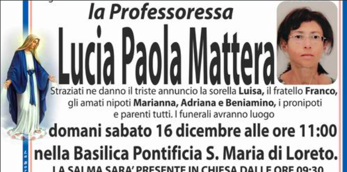 Si terranno domani 16 dicembre alle ore 11:00 nella Basilica Pontificia S. Maria di Loreto a Ischia i funerali della professoressa Lucia Paola Mattera, travolta e uccisa da un tir nel comune di Pietradefusi, in provincia di Avellino, più precisamente nella frazione di Dentecane.