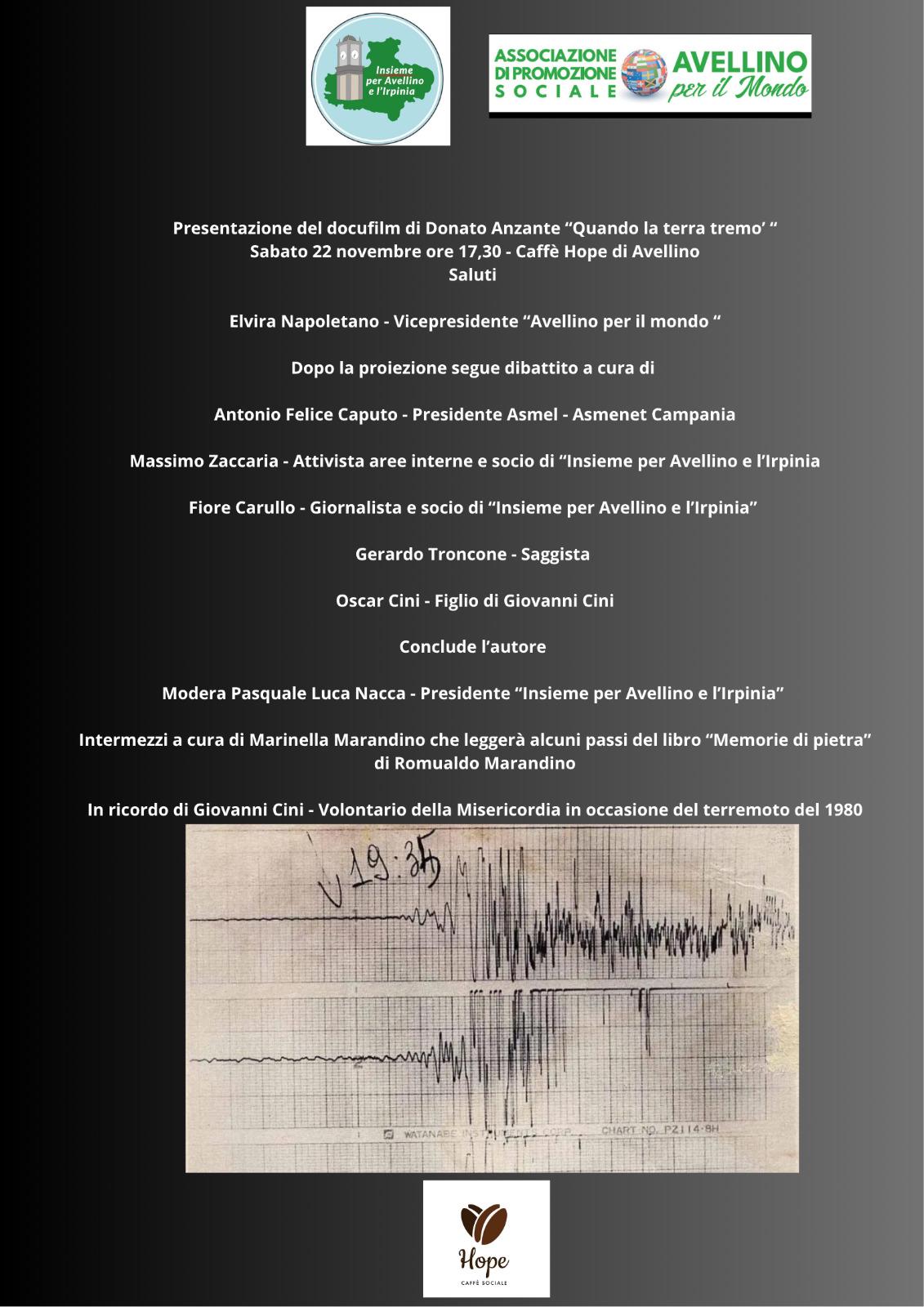 Sabato 22 novembre alle ore 17:30, presso il Caffè Hope di Avellino, sarà presentato il docufilm di Donato Anzante “Quando la terra tremò”, un’opera dedicata alla memoria del terremoto del 1980 e alle storie di chi visse in prima linea quei giorni drammatici.