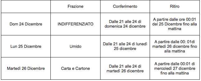 Va sottolineato, in prima istanza, che negli imminenti giorni di festa, la raccolta proseguirà secondo calendario, con garanzia di ritiro della frazione indifferenziata e della frazione organica, ad esclusione del ritiro del vetro, per liberarsi del quale i cittadini potranno servirsi delle campane stradali.