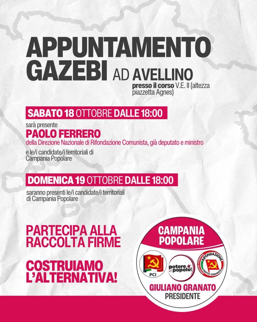 Nel comunicato diffuso dagli organizzatori si legge: “Durante entrambe le giornate è possibile partecipare alla raccolta firme per sostenere la costruzione di una vera alternativa popolare, fuori dagli schemi ormai logori di centrodestra e centrosinistra, rivendicando un nuovo protagonismo per chi non si rassegna e vuole una Campania più giusta, più solidale, davvero inclusiva. Partecipare significa costruire insieme il cambiamento reale, con la forza delle idee e la volontà di restituire dignità e diritti a tutte e tutti. Costruiamo l’alternativa, partendo dal basso, nelle piazze e tra la gente.”