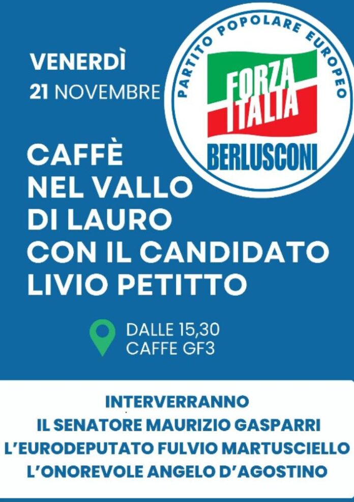 Vallo di Lauro – Prosegue la campagna elettorale di Forza Italia in vista delle prossime consultazioni: venerdì 21 novembre, alle ore 15:30, il candidato Livio Petitto incontrerà cittadini e simpatizzanti al Caffè GF3 per un momento di confronto diretto.