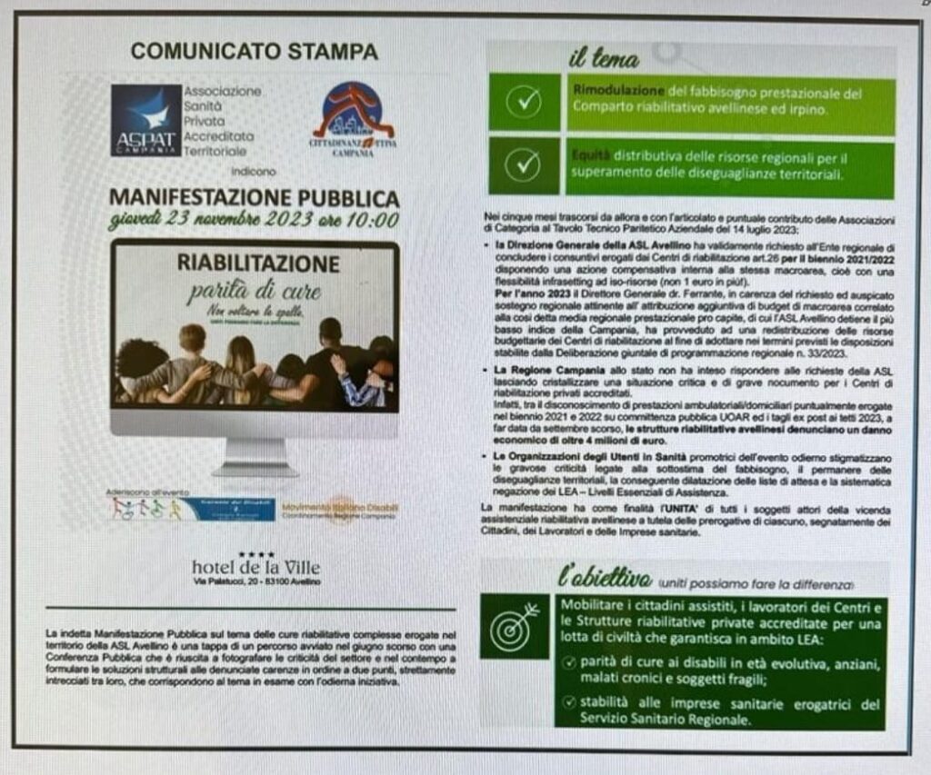 Sulla stessa tematica indetta anche una manifestazione pubblica per il 23 novembre alle ore 10:00 presso l’Hotel de la Ville, sempre ad Avellino
