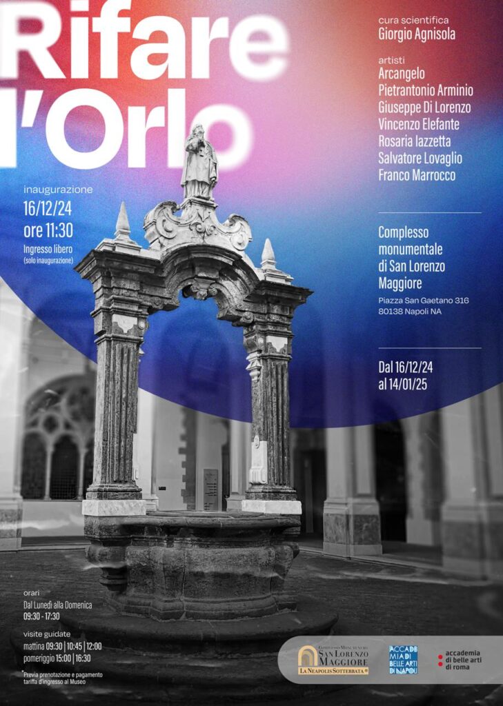 “Rifare l’orlo” è una mostra itinerante che interessa diverse città italiane; ha al suo attivo già due tappe significative, la prima nel Castello di Bisaccia (AV) svoltasi dal 23/07/’22 al 20/08/’22, a cura del prof. Donato Salzarulo, la seconda presso il Museo della seta del Belvedere di San Leucio di Caserta (dal 14/12/’22 al 14/01/’23, a cura del prof. Giorgio Agnisola) e attualmente, dal16/12/2024 al 14/01/2025, al Complesso Monumentale di San Lorenzo a Napoli (curatore scientifico prof. Giorgio Agnisola).
