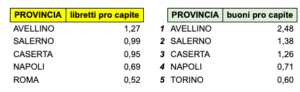 Avellino è la prima provincia in Italia per numero di libretti e buoni pro-capite: con una media di 1,27 libretti e 2,48 buoni per ciascun abitante, la provincia irpina conferma il suo primato sulle 105 province italiane.