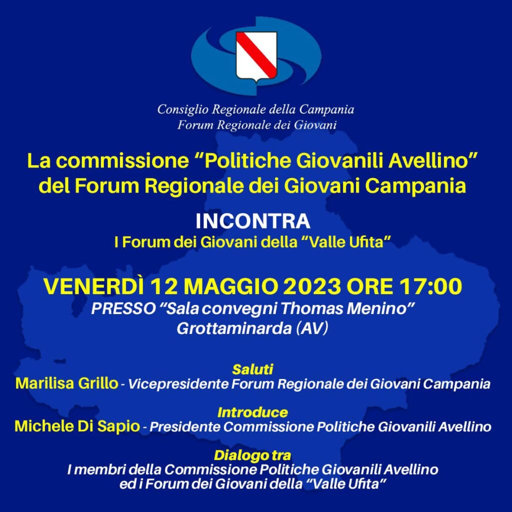 Venerdì 12 maggio alle ore 17:00 presso la sala convegni “Thomas Menino” del Comune di Grottaminarda incontro tra la Commissione politiche giovanili Avellino del Forum Regionale dei Giovani ed i Forum dei Giovani della Valle Ufita.