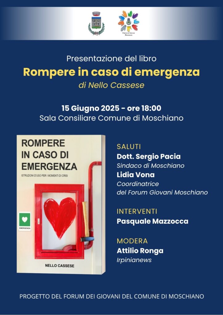 MOSCHIANO – La scrittura può salvare un giovane di memo di 30 anni in un momento negativo della propria esistenza, anche se il protagonista di questi nove giorni di esplosione di emozioni e’ un giornalista? Sara’ una delle domande su cui oggi, promosso dal Forum dei Giovani di Moschiano e dal Comune di Moschiano, i giovani del comune del Vallo di Lauro si confronteranno con l’autore di “Rompere in caso di emergenza”, il giornalista Nello Cassese, direttore di Zerottantuno News e corrispondente dal Vallo di Lauro e Baianese de “Il Mattino”. Un libro di straordinaria attualità, proprio alla luce dell’epilogo di vicende di storie di amore chiuse e finite nel sangue. Dopo i saluti del sindaco Sergio Pacia e della presidente del Forum Lidia Vona, sarà lo stesso autore a parlare del suo libro e ci sarà l’intervento di Pasquale Mazzocca, componente del Forum. A moderare l’incontro Attilio Ronga.