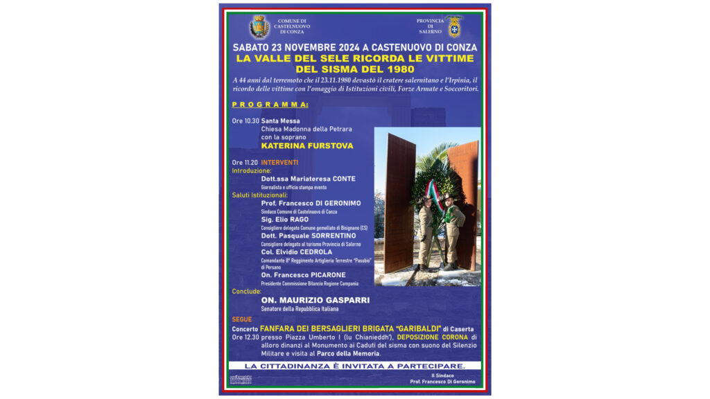 Castelnuovo di Conza (Sa). Sarà il senatore della Repubblica italiana, Maurizio Gasparri, a concludere gli interventi istituzionali della cerimonia in ricordo delle vittime del sisma dell’Irpinia che si terrà sabato a Castelnuovo di Conza. L’evento, organizzato dal Comune di Castelnuovo di Conza con il patrocinio della Provincia di Salerno, in occasione del 44esimo anniversario del terremoto del 23.11.1980, si svolgerà sabato 23 novembre 2024 a partire dalle ore 10.30 a Castelnuovo di Conza alla presenza della Fanfara militare della Brigata Bersaglieri “Garibaldi” di Caserta. La manifestazione avrà inizio alle ore 10.30 presso la Chiesa della Madonna della Petrara dove sarà celebrata una messa in ricordo delle vittime del terremoto che distrusse e rase al suolo decine di comuni del cratere salernitano e dell’Irpinia. I momenti di preghiera saranno accompagnati dalla voce de la soprano Katerina Furstova. Alle ore 11.20, seguirà un momento istituzionale con gli interventi del sindaco del Comune di Castelnuovo di Conza, Francesco Di Geronimo, del consigliere del Comune di Bisignano, Elio Rago, del consigliere delegato al turismo della Provincia di Salerno, Pasquale Sorrentino, del comandante dell’ottavo Reggimento Artiglieria Terrestre Pasubio di Persano, il colonnello Elvidio Cedrola, del Presidente della Commissione Bilancio della Regione Campania, Francesco Picarone e del Senatore della Repubblica Italiana, Maurizio Gasparri. Al termine degli interventi farà seguito il concerto della Fanfara militare della Brigata Bersaglieri Garibaldi di Caserta per poi, alle ore 12.30 proseguire in Piazza Umberto I con la deposizione della corona di alloro al monumento dei caduti del terremoto accompagnata dal suono del silenzio militare e dalla visita al Parco della Memoria. Parteciperanno tra gli altri, oltre ai sindaci del salernitano, anche l’associazione bersaglieri 67esimo Fagarè composta da militari ed ex militari di Persano, provenienti da tutta Italia, che nelle ore immediatamente successive al terremoto del 23 novembre 1980 prestarono aiuto e soccorso alle popolazioni terremotate del cratere salernitano.