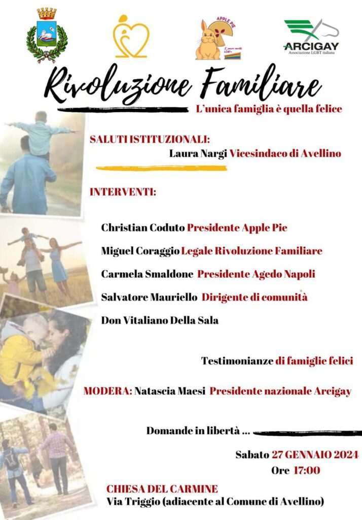 Sabato 27 gennaio, alle ore 17:00, presso la chiesa del Carmine, nei pressi del Comune di Avellino, si terrà un nuovo appuntamento con “Rivoluzione Familiare”, la campagna di sensibilizzazione ideata dall’associazione Apple Pie Lgbt+ Avellino Associazione Aderente Arcigay per sensibilizzare l’opinione pubblica sull’urgenza del riconoscimento della possibilità di adottare sia a single che a coppie unite civilmente, al di là del loro orientamento.