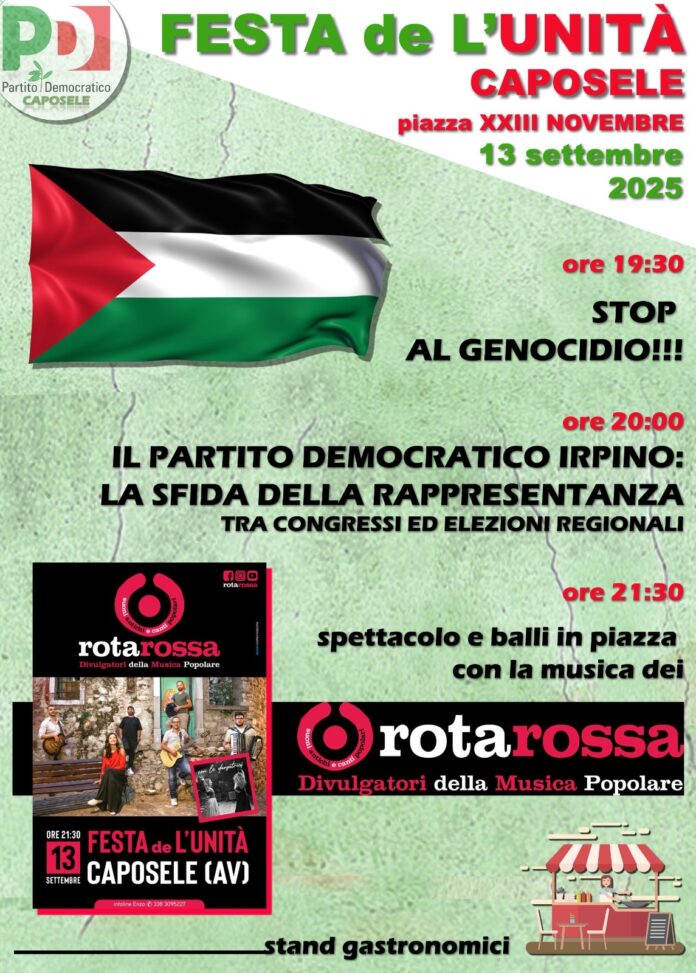 Tutto pronto per la Festa de L’Unità che si terrà sabato 13 settembre 2025 a Caposele.
