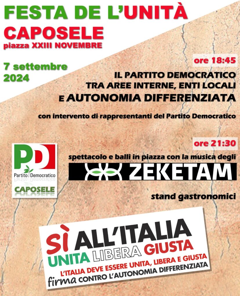 Si accendono i motori per la Festa del L’Unità che si terrà sabato 07 settembre 2024 a Caposele.