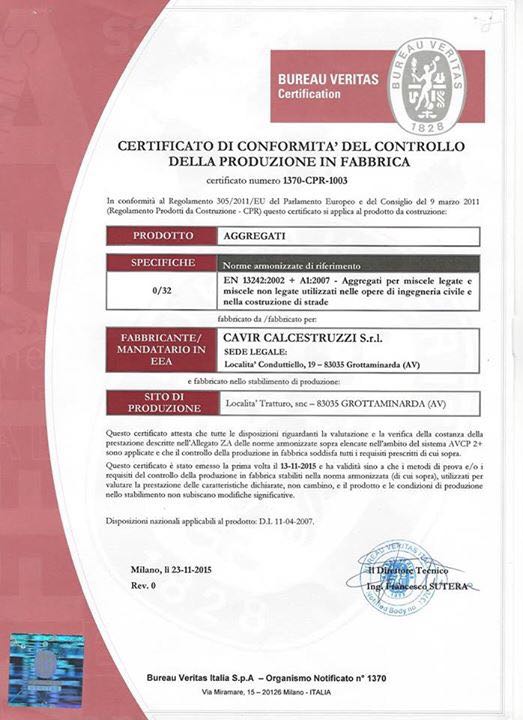 A garanzia dell’affidabilità del proprio lavoro la Cavir srl è dotata di un sistema di Certificazione conforme alle norme EN 13242, al fine di meglio garantire un’efficiente fornitura di servizi di trattamento e smaltimento di rifiuti ricercando oltre alla soddisfazione delle esigenze ed aspettative del cliente anche la salvaguardia del concetto di Sviluppo Sostenibile.