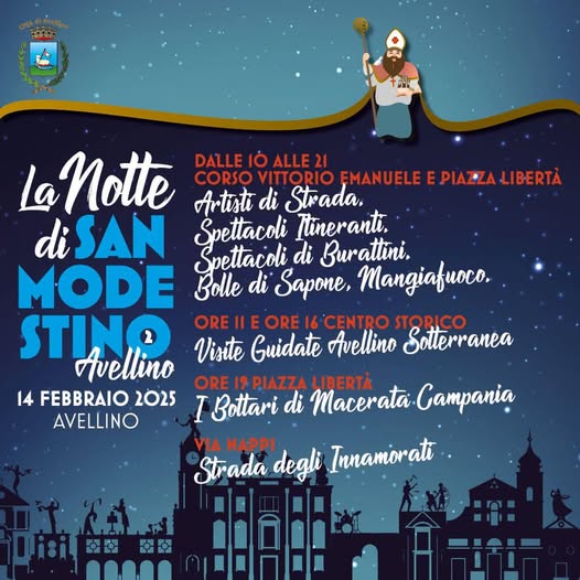Dunque, è tutto pronto per la Notte di San Modestino, l’evento organizzato dall’Amministrazione Nargi in occasione della Festa dei Santi Patroni di Avellino, Modestino, Fiorentino e Flaviano, domani, 14 febbraio. L’ente di Piazza del Popolo ha rifinito il ricco programma delle iniziative di intrattenimento che allieteranno una giornata a cui la comunità è sempre più legata, alla riscoperta delle proprie radici culturali e religiose, e che sarà ulteriormente impreziosita da una Notte del Commercio che perdurerà fino alle ore 22 e dalla riscoperta turistica del cuore antico, con la ripartenza dei tour guidati di “Avellino Sotterranea”.