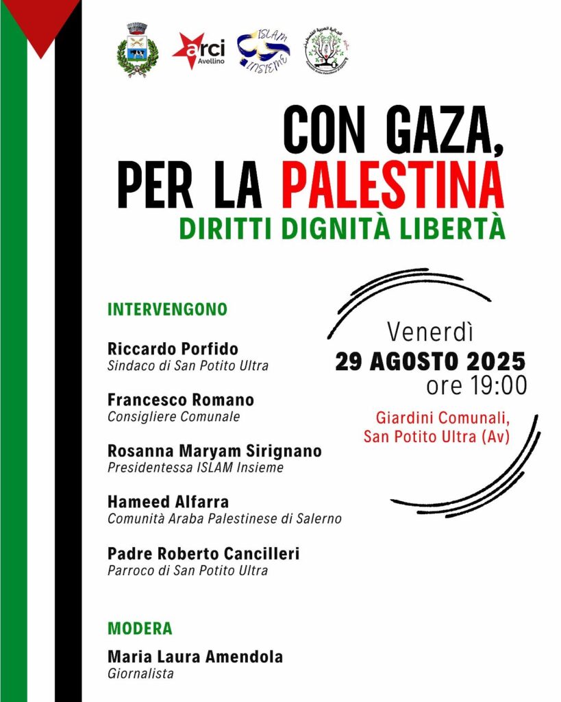 Un momento di riflessione e solidarietà internazionale animerà i Giardini Comunali di San Potito Ultra venerdì 29 agosto 2025 alle ore 19:00, con l’iniziativa pubblica intitolata “Con Gaza, per la Palestina – Diritti, Dignità, Libertà”.