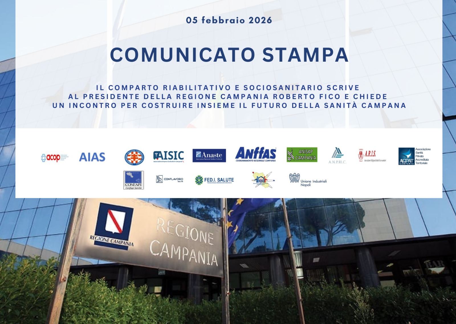 Le principali Associazioni di Categoria del comparto riabilitativo e sociosanitario privato accreditato della Campania hanno inviato una lettera aperta al neo Presidente della Regione Campania, On. Roberto Fico, richiedendo un incontro istituzionale per avviare una nuova fase di dialogo e concertazione sul futuro della sanità territoriale regionale.