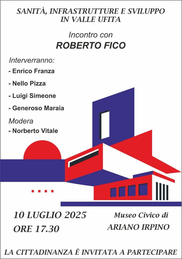 Si terrà giovedì 10 luglio 2025, alle ore 17:30, presso il Museo Civico di Ariano Irpino, un importante incontro pubblico dal titolo: “Sanità, Infrastrutture e Sviluppo in Valle Ufita”. Un’occasione di confronto aperto per il futuro del territorio, che vedrà la partecipazione di figure di rilievo del panorama politico locale e nazionale.