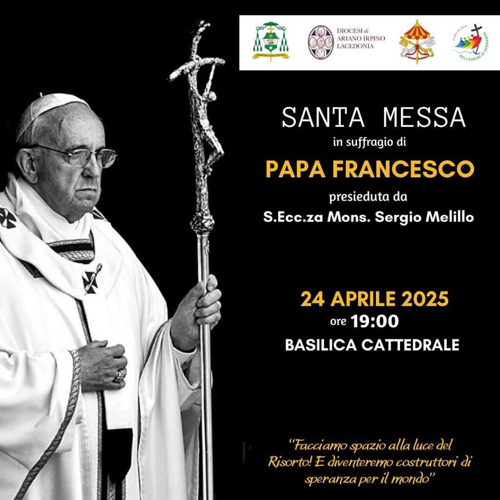 La Diocesi di Ariano Irpino-Lacedonia si stringe in un momento di profonda preghiera e raccoglimento per ricordare Papa Francesco. Una Santa Messa in suffragio del Pontefice sarà celebrata giovedì 24 aprile 2025, alle ore 19:00, presso la Basilica Cattedrale.