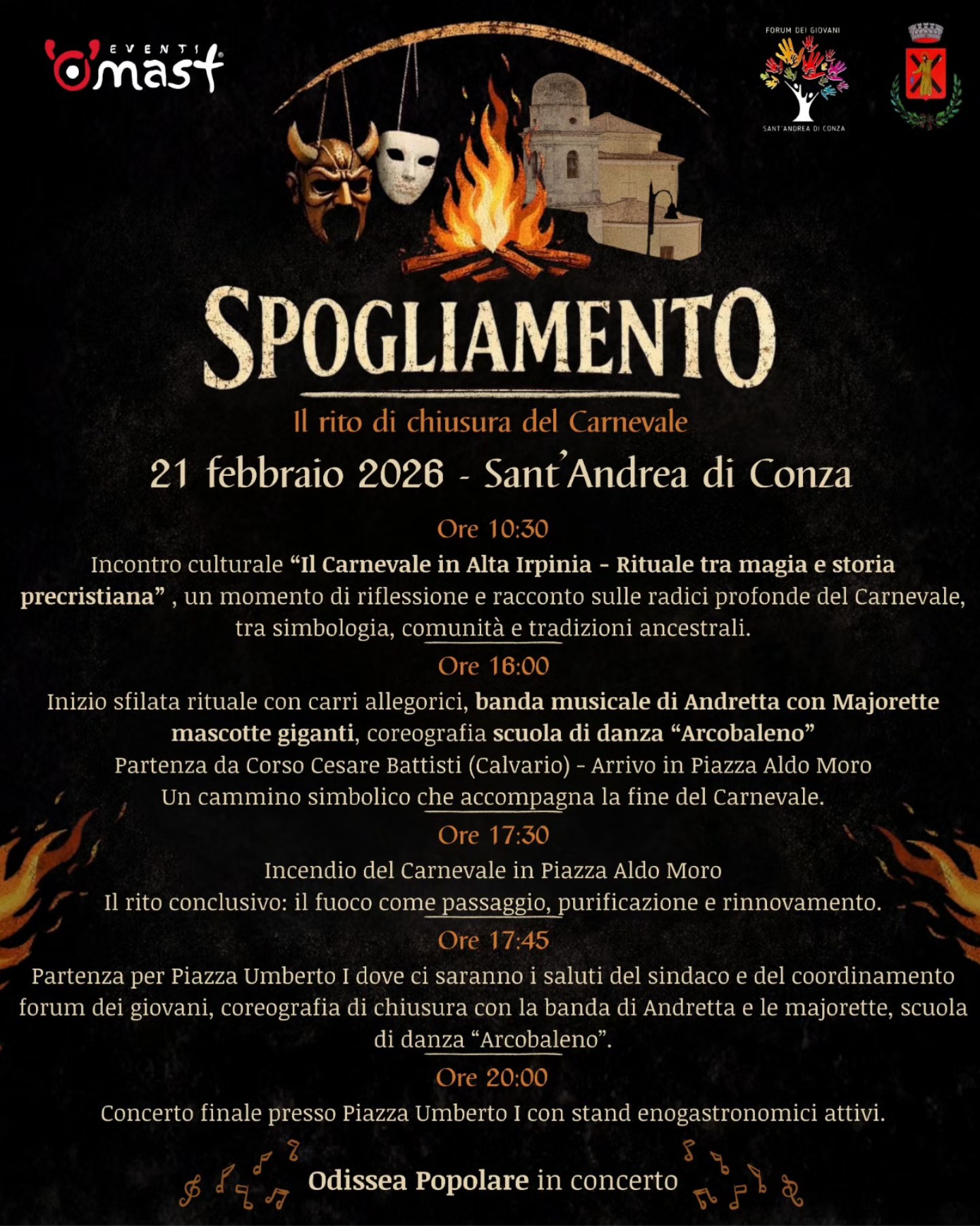 Sant’Andrea di Conza si prepara a vivere uno degli appuntamenti più suggestivi del suo calendario culturale. Il 21 febbraio 2026 va in scena “Spogliamento”, il rito di chiusura del Carnevale che intreccia fuoco, maschere, musica e comunità, riportando alla luce simboli e tradizioni di origine precristiana.