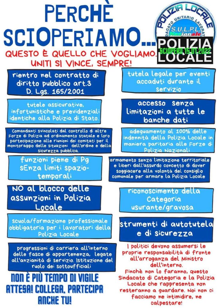 Il 15 gennaio, sciopero nazionale della Polizia Locale Italiana.